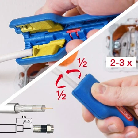 - schnelles Entmanteln und Abisolieren von Koaxialkabeln in nur einem Arbeitsgang